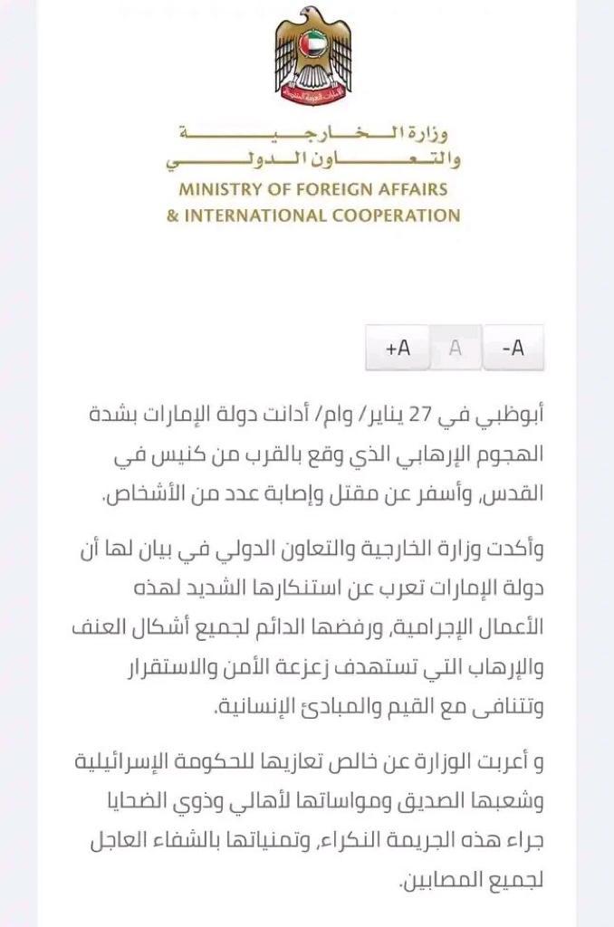 واستنكرت الإمارات بشدة عبر وزارة خارجيتها العمل الذي وصفته بـ"الإرهابي" الذي وقع بالقرب من كنيس في القدس، وأسفر عن مقتل عدد من الأشخاص.