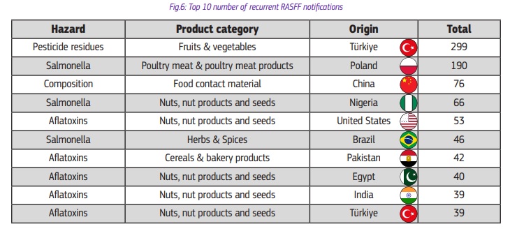 ووفق نفس المصدر، فإن من أبرز أسباب إصدار الإشعارات الصحية في حق البضائع من طرف نظام "راصف" الأوروبي، هي بقايا المبيدات، وهي "السبب الصحي" الأكبر المُسجل في حق البضائع التركية، ثم بكتيريا السالمونيلا، وفطريات الأفلاتوكسينس.
