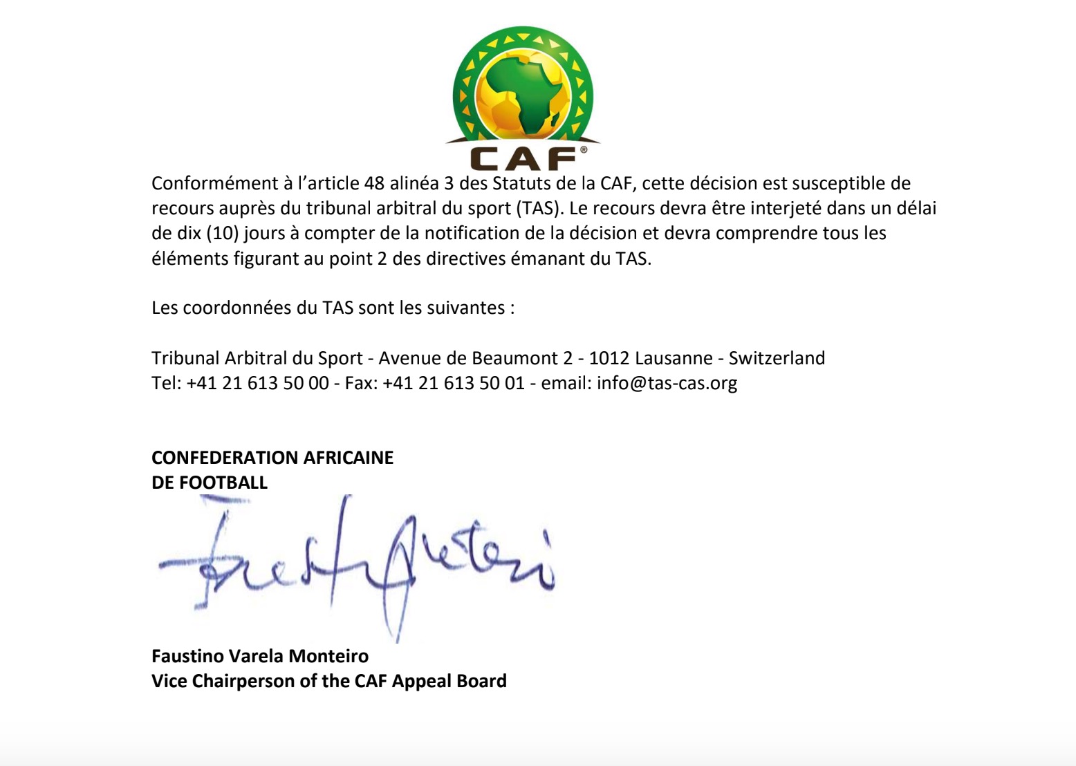 وجائت هذه المرة المرسالة موقعة ومرسلة من المقر الرئيسي للكاف بالقاهرة، حيث تضمنت أسماء اللجنة التي بثت في استئناف اتحادية الجزائر لكرة القدم والتي ضمت عضو من الرأس الاخضر وعضو من الكوغو الديمقراطية وعضو من الطوغو .