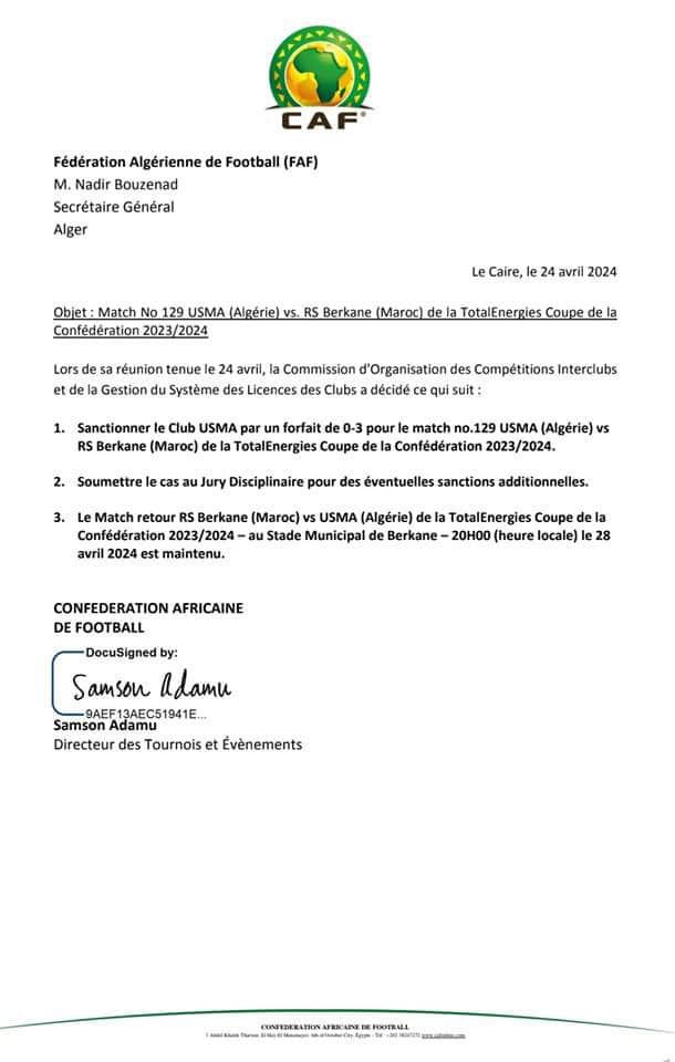خطاب الاتحاد الإفريقي لكرة القدم والذي حمل رقم 129 أكد أن اللجنة المنظمة لمسابقات الأندية داخل الاتحاد الإفريقي لكرة القدم خلال اجتماعها الذي عُقد اليوم 24 أبريل الجاري، قررت وفق إدارة نظام تراخيص الأندية ما يلي: