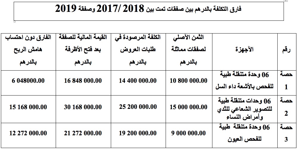 وتصل قيمة الصفقة التي حازت عليها شركتي "بروماميغ" و"رياكتين" قرابة السبعة ملايير سنتيم، تخص شراء 06 وحدات متنقلة طبية  للفحص بالأشعة لداء السل، والتي تم اقتناءها بـ 16.848.000,00 درهما أي 2.808.000,00 درهما للوحدة المتنقلة والحال أن نفس المعدات تم شراءها في صفقة سابقة بـ10.800.000,00 درهما أي مائة مليون درهم للوحدة، مع العلم أن الوزارة خصصت الكلفة التقديرية في الصفقة بـ"أربعة عشرة مليون و أربع مئة ألف درهم"، في الوثائق الرسمية للوزارة، حيث وصل الفارق إلى ستة ملايين درهم.