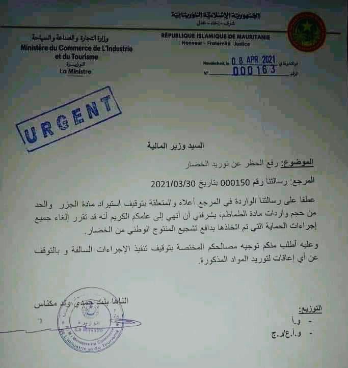 ووفق ما جاء في مراسلة من وزيرة التجارة والصناعة والسياحة الموريتانية، موجهة إلى وزير المالية، فقد تقرر إلغاء جميع الإجراءات الحمائية المتخذة "بدافع تشجيع المنتوج الوطني من الخضار"، وطالبت المراسلة من مصالح المالية التوقف عن تنفيذ الإجراءات المعلن عنها يوم 30 مارس 2021، وبالتالي التوقف عن إعاقة توريد الجزر والطماطم إلى الأسواق الموريتانية، وفق منطوق الوثيقة.