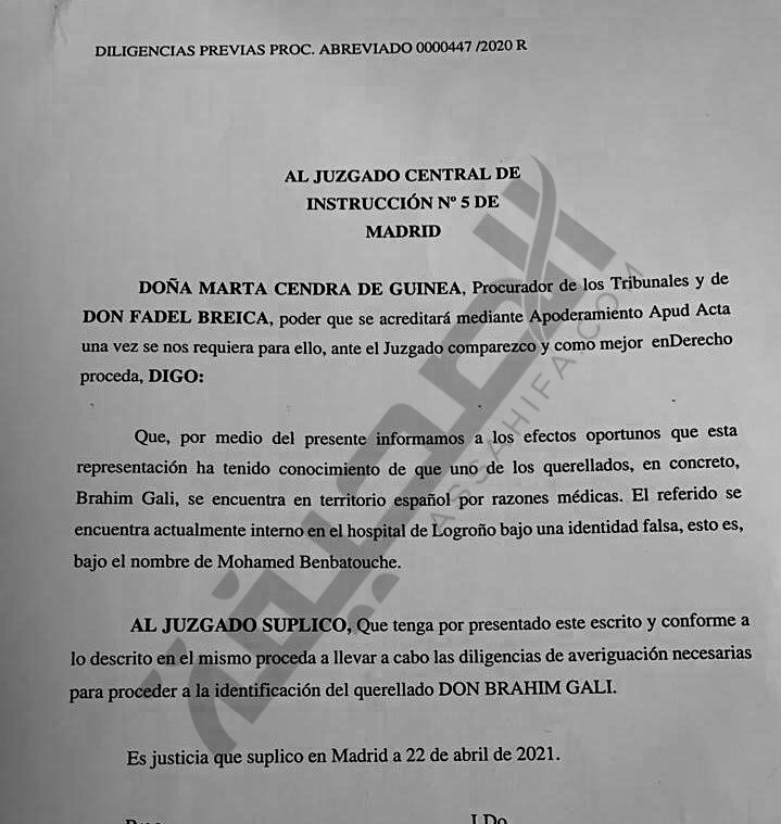 ووفق المراسلة التي بُعثت عبر المنصة الرقمية الرسمية للمدعين والمحامين بتاريخ 22 أبريل 2021، فإن المدعية العامة مارتا سيندرا نبهت إلى وجود معلومات تفيد بأن "أحد المتهمين، وعلى وجه التحديد إبراهيم غالي، يوجد على الأراضي الإسبانية لأسباب علاجية، وقد دخل مستشفى لوغرونيو بهوية مزورة تحت اسم محمد بن بطوش"، وفق منطوق الوثيقة، التي طلبت من محكمة التعليمات المركزية رقم 5 القيام بالتحقيقات اللازمة لتحديد ما إذا كان هذا الشخص هو نفسه غالي.