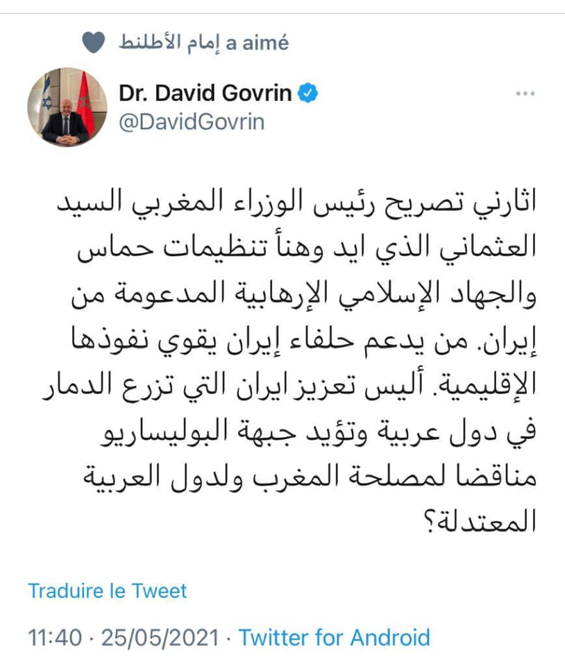وبعد عودة غوفرين إلى المغرب، نشر تغريدة على حسابه الرسمي بموقع التواصل الاجتماعي "تويتر" كتب فيها: "أثارني تصريح رئيس الوزراء المغربي السيد العثماني الذي أيد وهنأ تنظيمات حماس والجهاد الإسلامي الإرهابية المدعومة من إيران".
