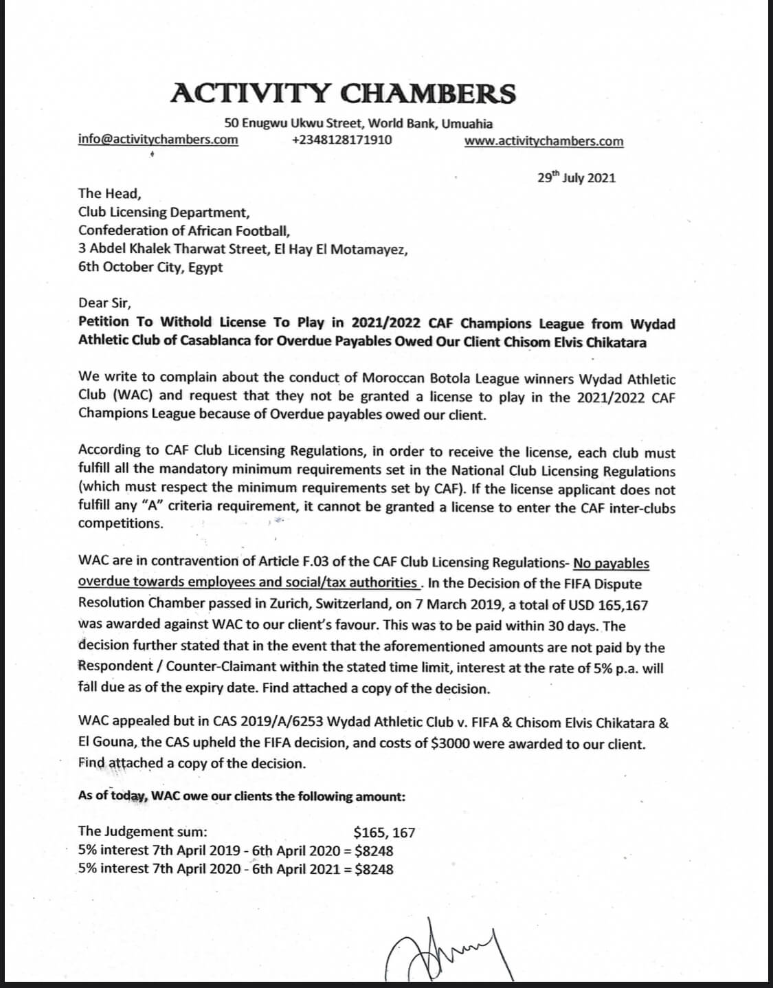 وكان محامي اللاعب الدولي النيجيري شيسوم شيكاتارا، المهاجم السابق لفريق الوداد الرياضي البيضاوي، قد راسل كل من الجامعة الملكية المغربية لكرة القدم والكونفدرالية الإفريقية للعبة "كاف"، من أجل اتخاد عقوبات انضباطية في حق النادي "الأحمر"، في إطار ملف النزاع القائم بين الطرفين.
