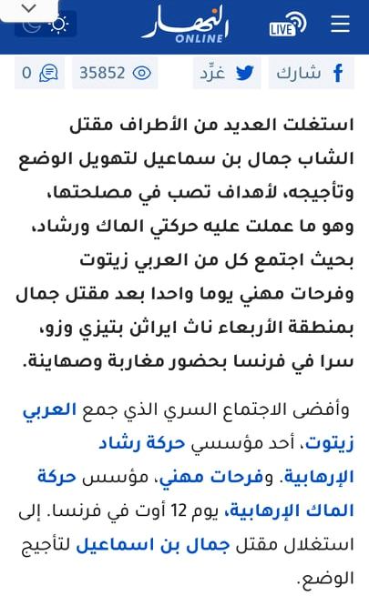 لكن ما لم تنتبه إليه "النهار" هو أن ما نشرته مستحيل عمليا، لأن قتل الشاب جمال، الذي تم بطريقة وحشية انتهت بإحراقه والتمثيل بجثته بعد إخراجه حيا يرزق من شاحنة الشرطة في بلدة "أربعاء ناث إيراثن" القبائلية، جرى يوم 11 غشت، أي قبل 24 ساعة من موعد الاجتماع الذي زعمت عقده بين زعيمي "الماك" و"رشاد".