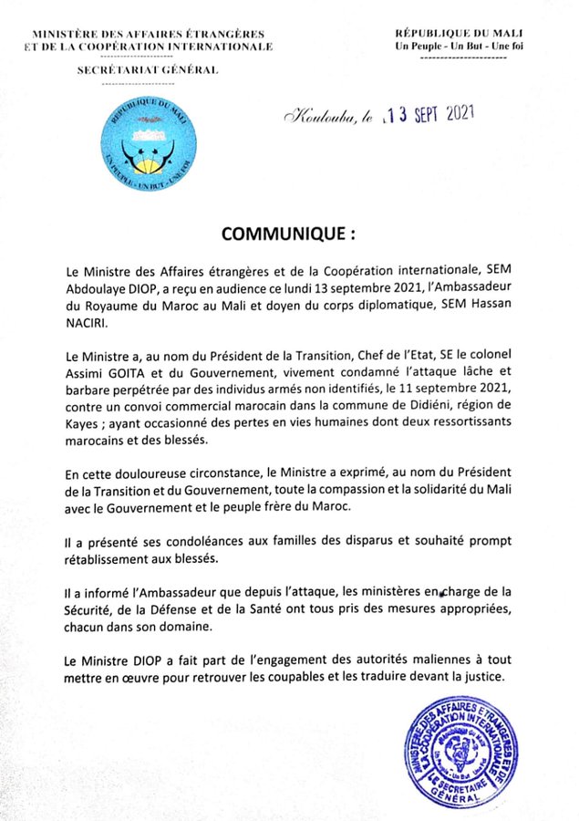 وأوضح البلاغ الصادر في ختام استقبال وزير الشؤون الخارجية والتعاون الدولي المالي، عبدلاي ديوب، أمس الإثنين، لسفير المغرب في مالي وعميد السلك الدبلوماسي، حسن الناصري، أن وزير الشؤون الخارجية والتعاون الدولي المالي "أدان بشدة نيابة عن الرئيس الانتقالي، رئيس الدولة العقيد عاصمي غويتا والحكومة، الهجوم الجبان والهمجي الذي ارتكبه مسلحون مجهولون، في 11 شتنبر 2021 ضد قافلة تجارية مغربية بجماعة ديديني بمنطقة كايس وتسبب في خسائر في الأرواح بينهم مواطنان مغربيان وجرحى".