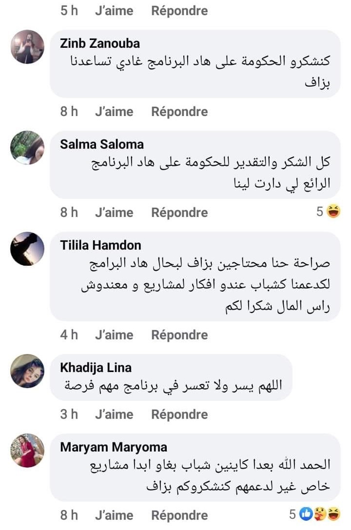 وخلت هذه الخطوة من أي إبداع أو اجتهاد، فالحسابات تحمل أسماء مثل "مريم مريومة" أو "زينب زنوبة" أو "سلمى سلومة" أو "ريم ريما"، ذلك أن من صنعوها لم يبذلوا أي مجهود في ابتكار أسماء وألقاب أقرب إلى التصديق، وما يزيد الأمر "فجاجة" هو أن جميع التعليقات اتفقت على الإطراء على عمل الحكومة، إذ يقول أحدها "نشكر الحكومة على هذا البرنامج الذي سيساعدنا كثيرا"، ويضيف آخر "الحمد لله، هناك شباب يريدون بدء مشاريعهم الخاصة يحتجون فقط لمن يدعمهم، نشكركم كثيرا"، أما تعليق ثالث فيقول "الله المستعان على المجهودات الجبارة التي تقوم بها الحكومة".