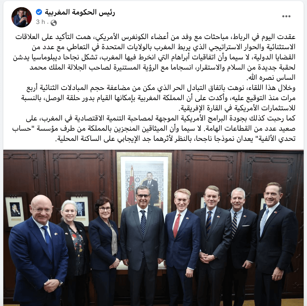 ونشر أخنوش على حساباته في مواقع التواصل الاجتماعي، قصاصة قال فيها إنه قد عقد اليوم في الرباط، مباحثات مع وفد من أعضاء الكونغرس الأمريكي، همت التأكيد على العلاقات الاستثنائية والحوار الاستراتيجي الذي يربط المغرب بالولايات المتحدة في التعاطي مع عدد من القضايا الدولية، مضيفا "لا سيما وأن اتفاقيات أبراهام التي انخرط فيها المغرب، تشكل نجاحا دبلوماسيا يدشن لحقبة جديدة من السلام والاستقرار، انسجاما مع رؤية الملك محمد السادس"، على حد تعبيره.