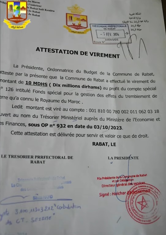 وجاء في الشكاية أن المستشارين توصلوا بوثيقة تفيد صرف الرئيسة لمبلغ مليار سنتيم، مساهمة من جماعة الرباط في الصندوق الخاص بتدبير الآثار المترتبة على الزلزال، وهو ما أكده مدير المصالح في شريط فيديو بثته الصفحة الرسمية الخاصة بجماعة الرباط على منصتي "فايسبوك" و"يوتوب"، مبرزة أن هذه الوثيقة المؤشر عليها من لدن خازن مدينة الرباط، جاءت مخالفة لمنطوق القانون التنظيمي 113.14 المتعلق بالجماعات الترابية، وخارج جميع الضوابط القانونية الأخرى.