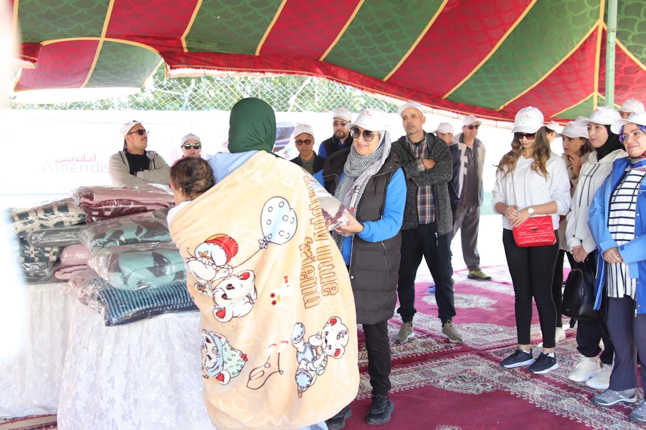 وفي إطار هذه القافلة التضامنية، أشرفت مريم الشلاوي، مديرة التواصل والتسويق بأمانديس، على عملية توزيع الأغطية والملابس على عدد من المستفيدات والمستفيدين المنحدرين من أسر معوزة، وذلك تحت شعار "شتاء دافئ".