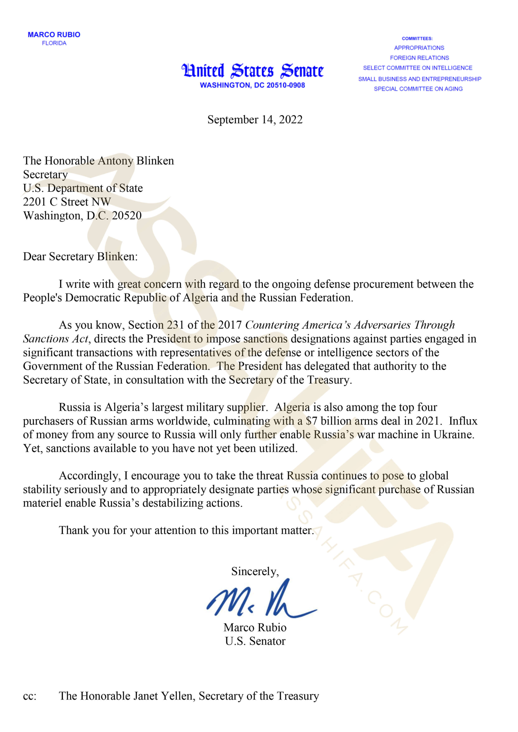 بَعَثَ السيناتور الأمريكي عن الحزب الجمهوري، ماركو روبيو برسالة إلى وزير الخارجية الأمريكي أنتوني بلينكين يدعوهُ فيها إلى معاقبة الجزائر بسبب شرائها "الشره" للأسلحة الروسية.