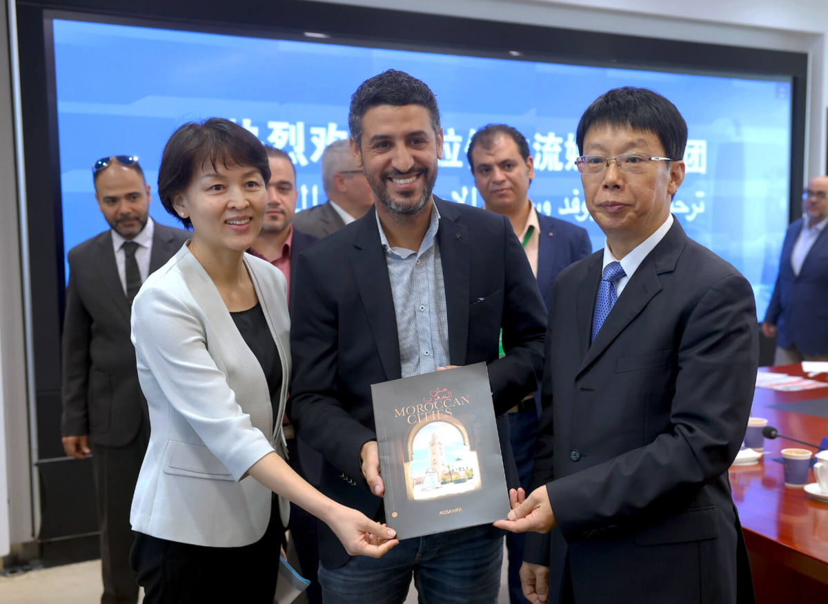 Khalid El Berhli, General Manager of Assahifa media group, presented the English version of Assahifa Tourism Magazine to Yu Shaoliang and Shi Xiang. The magazine highlights the most important tourist areas in Morocco and serves as a guide for 12 Moroccan cities. It has been published in both Arabic and English.