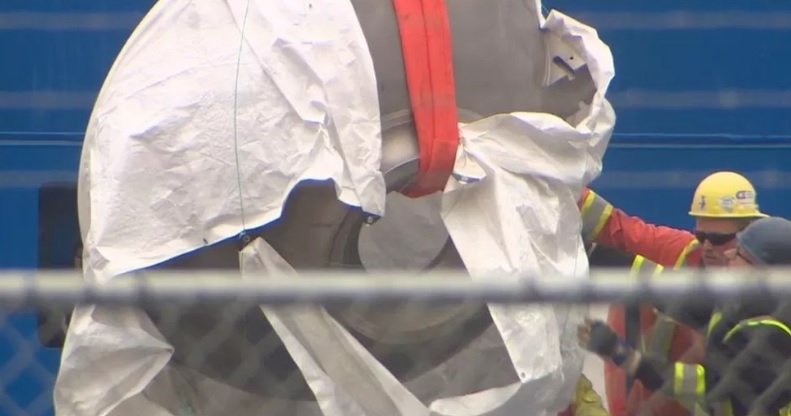 Photographs showed metal pieces from the sub covered in tarps before cranes lifted them on to trucks.