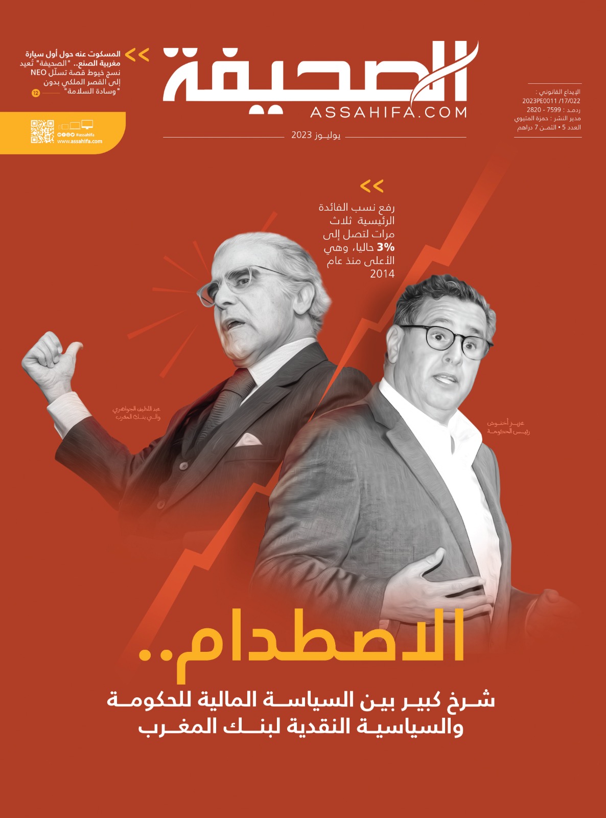 ما هي خلفيات الاصطدام المباشر بين والي بنك المغرب، عبد اللطيف الجواهري، ورئيس الحكومة، عزيز أخنوش؟ ما هي تفاصيل هذا الخلاف وكيف نشأ؟ ما خلفيات الأرقام والمعطيات المتضاربة بين رئاسة الحكومة، والبنك المركزي المغربي؟ كلها أسئلة من بين أخرى تخص التضخم وارتفاع أسعار المواد الاستهلاكية، والشرخ الكبير بين السياسة النقدية لبنك المغرب، والسياسة المالية للحكومة، ستجدونه في العدد الخامس من "الصحيفة" في تقرير مطول يرصد أهم محطات الخلاف، وخلفياته، والمستفيدين منه، وتأثير ذلك على مصداقية المغرب على مستوى المؤسسات المالية الدولية، وعند المستثمرين المحليين والأجانب.